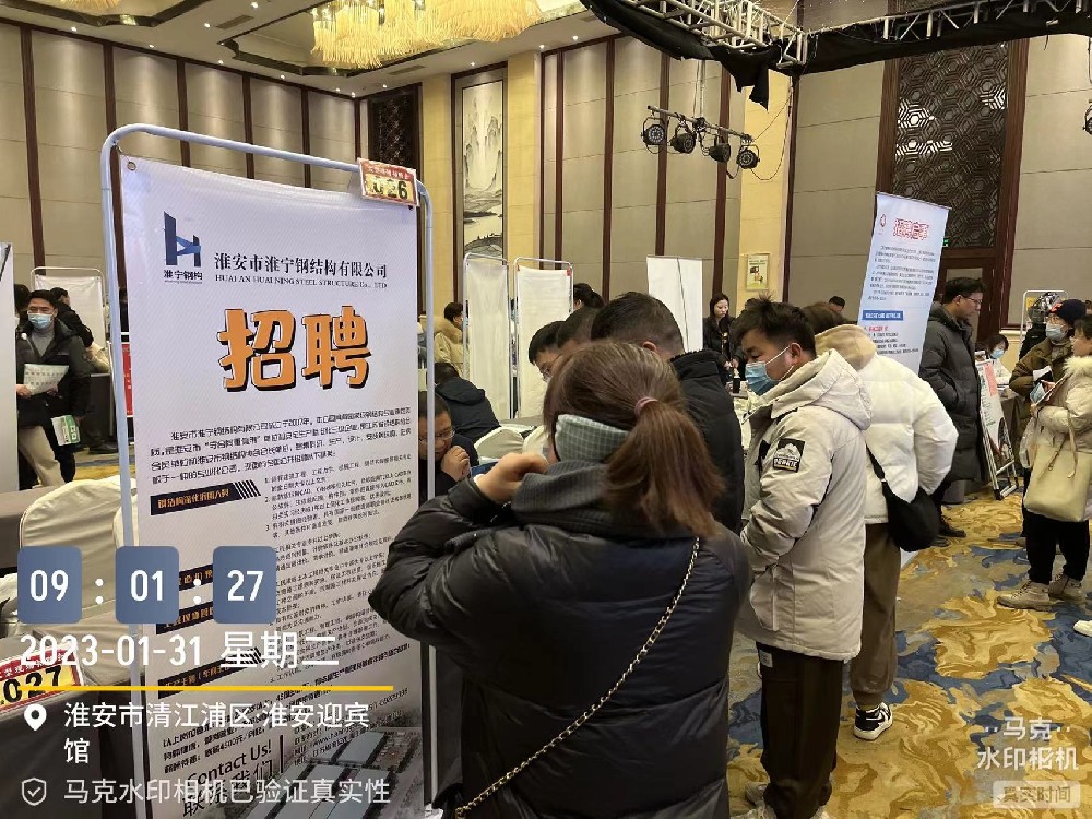 2023年1月31日上午,淮安市2023年“庆新春 促就业”大型综合招聘会在淮安市迎宾馆举办,此次招聘会吸引众多市民前来求职。淮安市淮宁钢结构有限公司位于淮安市清浦工业新区浦发大道18号,具有国家级钢结构专业承包资质,是国家和省、市三级高新技术企业及淮安市“守合同重信用”单位和安全生产标准化三级企业,是江苏省钢结构协会会员单位和淮安市钢结构协会副会长单位,企业通过ISO9001质量体系、ISO14001环境管理体系、ISO45001职业健康安全管理体系认证。2022年已实现月产3000吨,年产值2亿人民币,2023年为扩大生产,提高产能,工程部总经理与行政部部长等领导早早来到招聘现场赶早忙“抢人”。