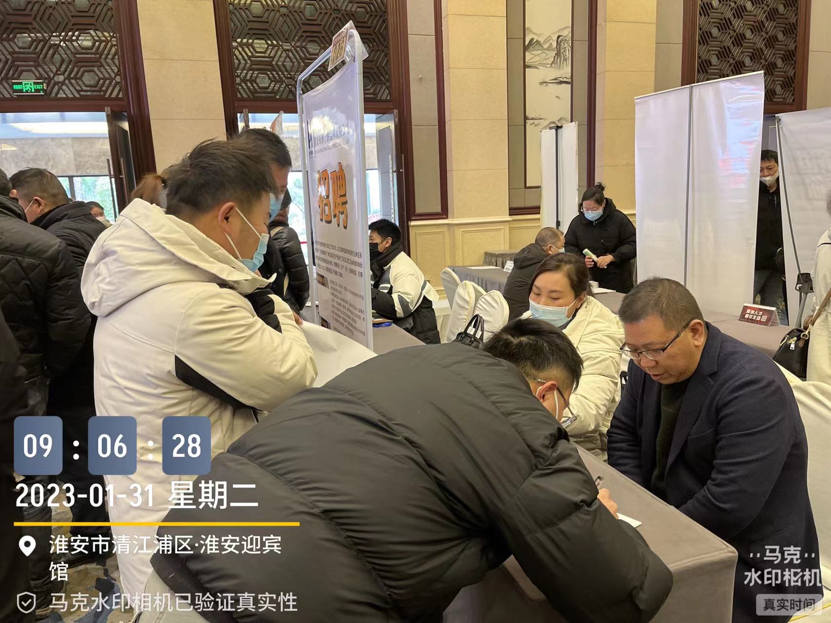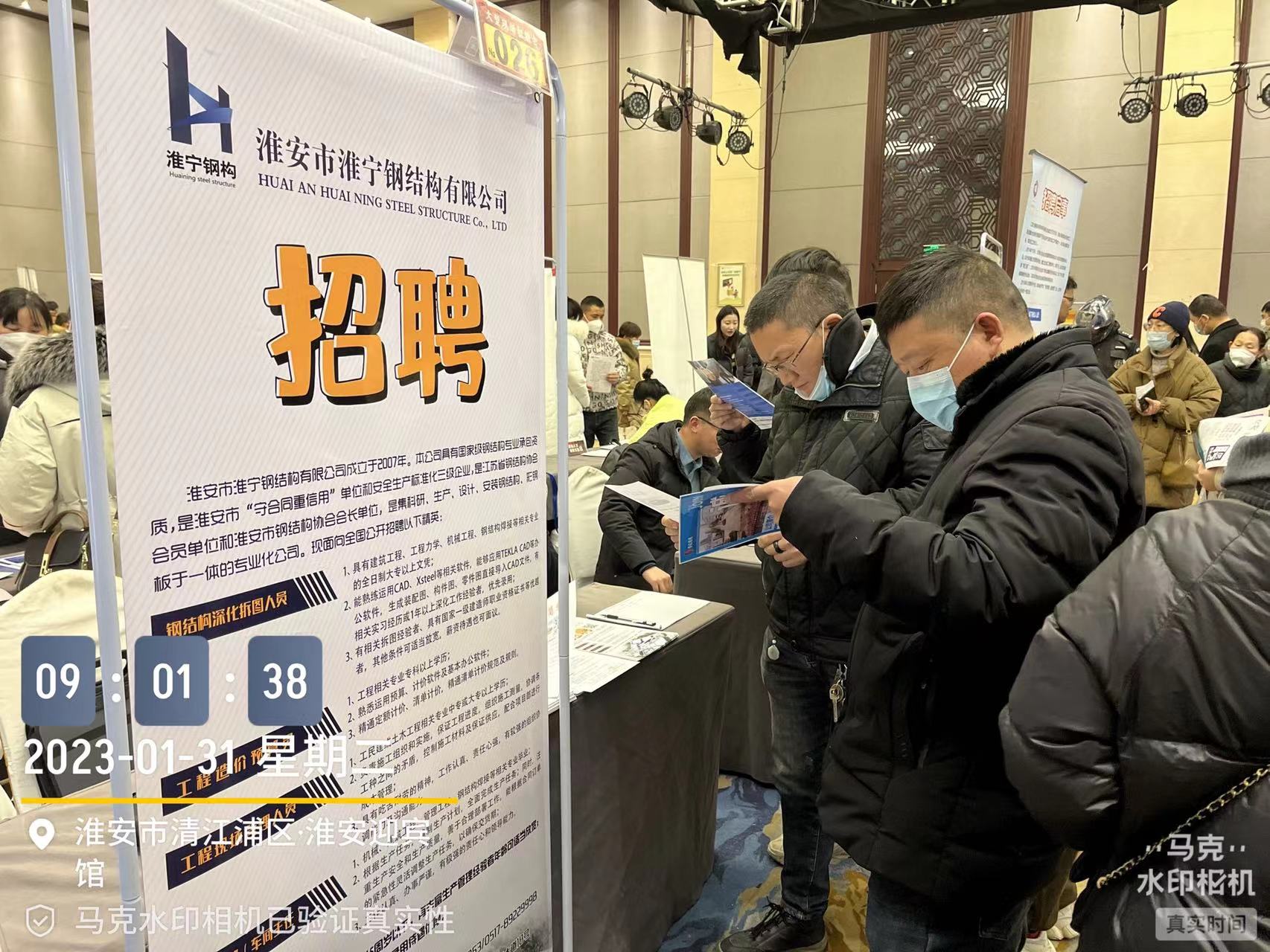 2023年1月31日上午,淮安市2023年“庆新春 促就业”大型综合招聘会在淮安市迎宾馆举办,此次招聘会吸引众多市民前来求职。淮安市淮宁钢结构有限公司位于淮安市清浦工业新区浦发大道18号,具有国家级钢结构专业承包资质,是国家和省、市三级高新技术企业及淮安市“守合同重信用”单位和安全生产标准化三级企业,是江苏省钢结构协会会员单位和淮安市钢结构协会副会长单位,企业通过ISO9001质量体系、ISO14001环境管理体系、ISO45001职业健康安全管理体系认证。2022年已实现月产3000吨,年产值2亿人民币,2023年为扩大生产,提高产能,工程部总经理与行政部部长等领导早早来到招聘现场赶早忙“抢人”。